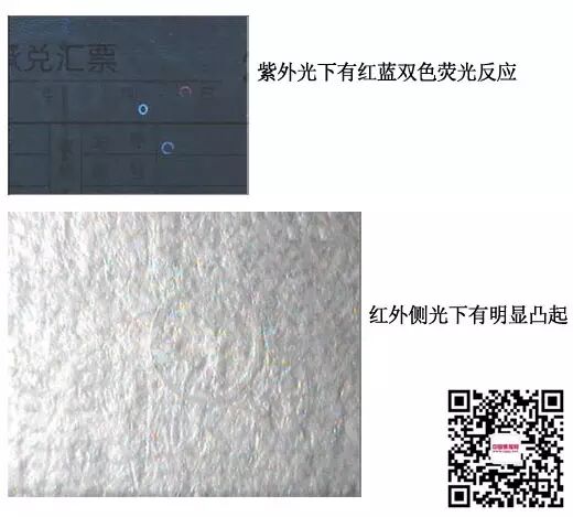 4. 纸张防伪:无色荧光纤维丝。在自然光下不可见,紫外下观察有满版的红、蓝色彩的荧光纤维丝,亮度、深浅不一,多为半圆形,少数为圆形或弧形。